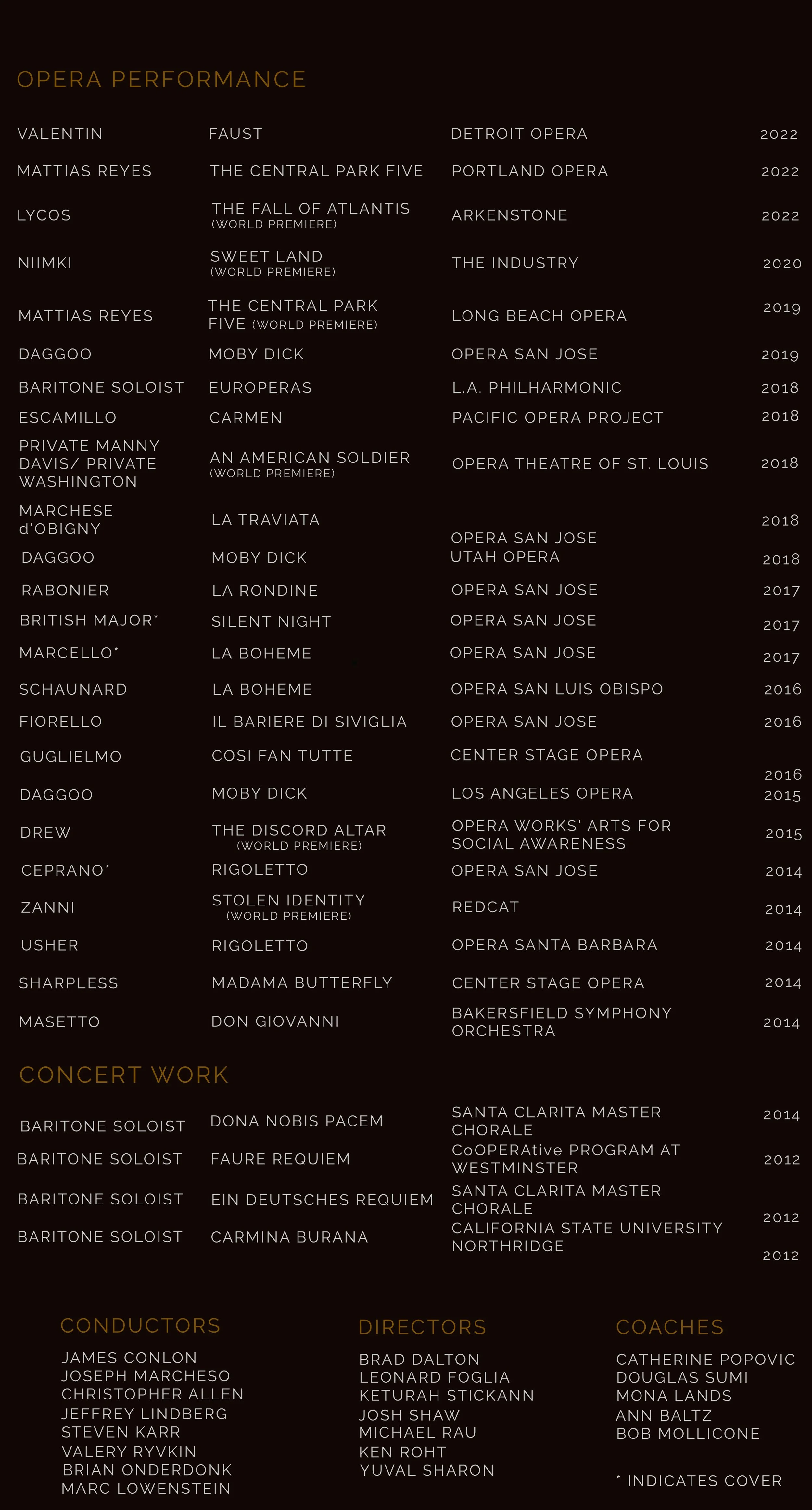 A singer of diverse talents, Nigerian American Baritone, Babatunde Akinboboye is known for his enthralling stage presence. He has performed with the Los Angeles Opera, Opera San Jose, Opera Santa Barbara, Long Beach Opera, and Utah Opera. Babatunde has also debuted the roles of Drew in the Opera Works’Arts for Social Awareness Project’s world premiere production of The Discord Opera, and Zanni in the world premiere of Gloria Coates’ Stolen Identity. His most recent performances include Daggoo in LA Opera’s Moby Dick, Escamillo in Pacific Opera Project’s production of Carmen, and Lucha’s Father in The Industry’s production of Hopscotch.